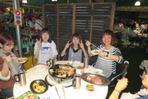今年のBBQは、34名参加。テーブルが6~7つに分かれました。仲良し女子会テーブルです。